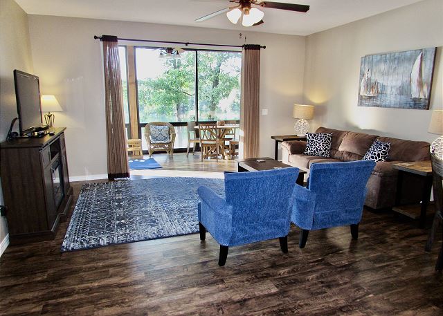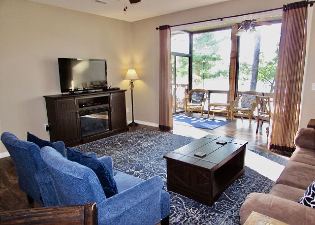 The guests of this 3 BR, 3 Bath condo located at Vickery Resort enjoy granite counter tops, washer, dryer, a full kitchen stocked with all the appliances and utensils needed to prepare a gourmet meal, large bedrooms, a master bedroom that looks out onto Table Rock Lake. The large 32-34' private deck overlooks a secluded cove on Table Rock Lake.