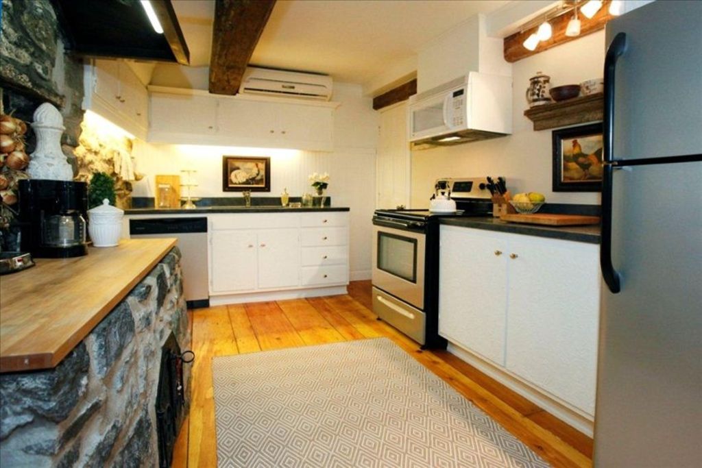 Next to the den, a 19th century French walnut dining table accommodates five people. Whether you plan an elegant dinner at home or just a quick bite before going out for the day, La Maison Dumas has everything you need to create the right ambiance. The kitchen has been fully refurbished and is well equipped including: concrete countertops, (5) appliances, microwave, cappuccino machine and much more!