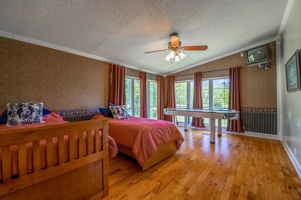 Upstairs there are 2 huge master bedrooms that each have king beds, sitting areas, bathrooms with jacuzzi tubs, and walkout balcony decks with gorgeous views. There is also the bunk room with 2 sets of bunk beds and also a loft area with a very comfy futon and Thomas the Tank Engine track set for the younger train enthusiasts. At the top is the tower bedroom which has incredible views in all directions and has a full bed in it.