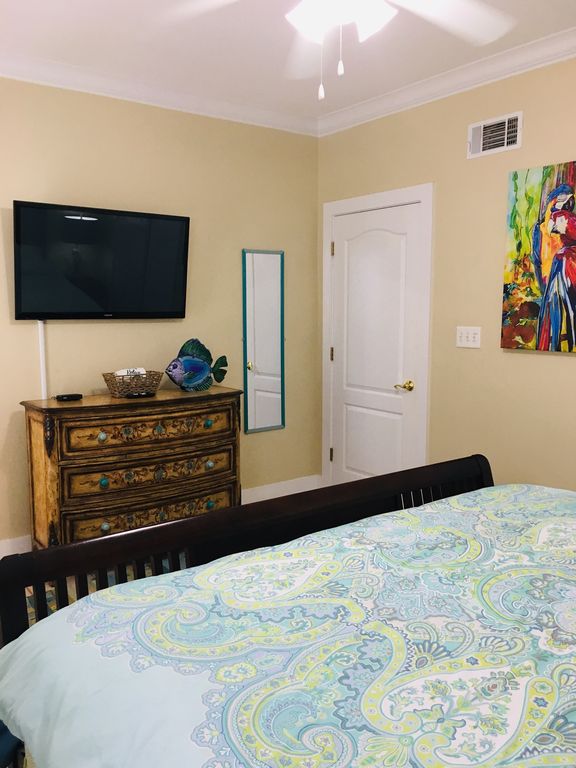 Our condo offers two 43" Flat screen TV's, dvd players, comfortable King size bed, Queen size sleeper sofa in the living room, free wifi, extended cable, & our kitchen is fully stocked. Just bring your groceries & you'll be set. Front loading washer and dryer. Condo is on the lower level & parking is directly in front of the unit.