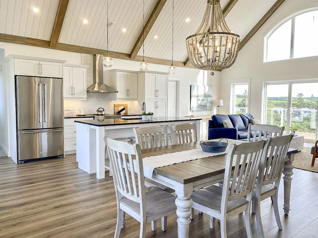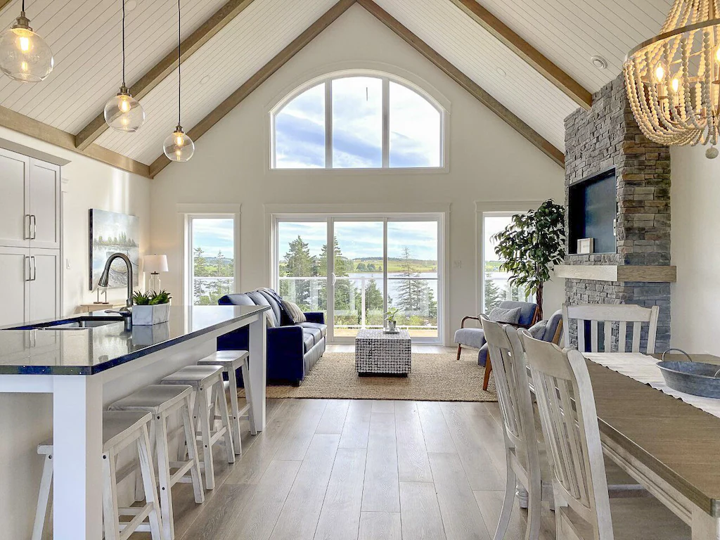 The main floor has an open concept kitchen-dining-living area that overlooks the water. The main floor also has a spacious entry, two king bedrooms and 2 baths. The entire front side of the main floor (living and both king bedrooms) have 10' patio doors that access the spacious deck overlooking the water.