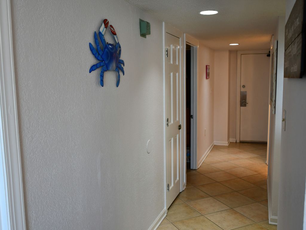 The floor plan of my condo includes a master bedroom with two queen size beds; a second bedroom with one queen size bed, and the living room has a couch that converts into a queen size bed. At the oceanfront end of the living room and master bedroom there are sliding glass doors that open onto the balcony. The floor plan also includes laundry room with a washer and dryer, a fully equipped kitchen and two full baths.