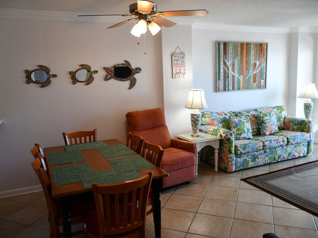 Our spacious oceanfront condominium has a large 6 foot by 24 foot balcony that enables you to experience an unobstructed, panoramic of the Grand Strand. It is a colorful 2- bedroom - 2 bath condo at the popular, beautiful, and recently renovated Bluewater Resort in Myrtle.