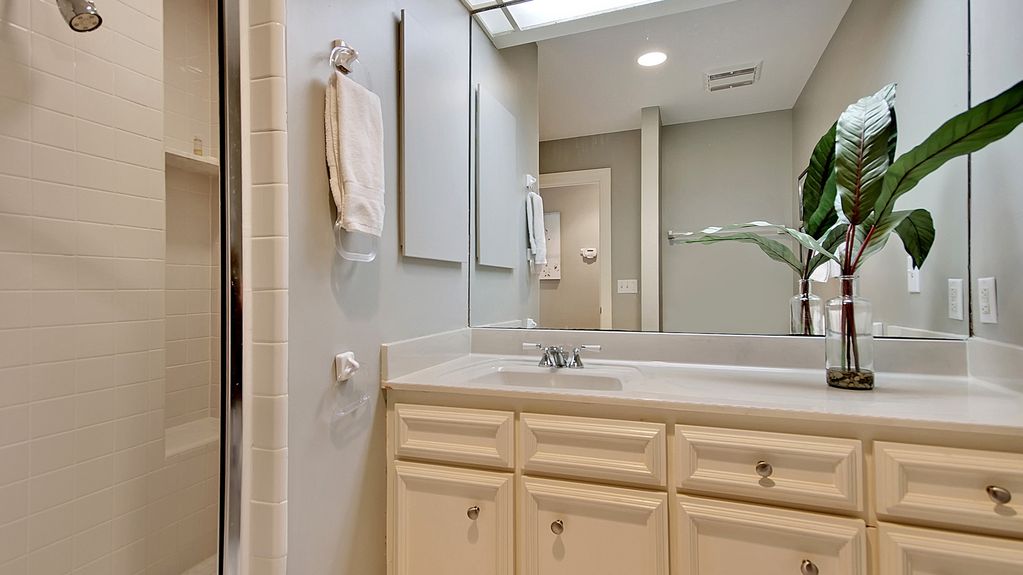 The house has a reverse floor plan offering some great views. Decks extend the entire length of the house with comfortable seating for enjoying the outdoors. Enter on the first floor into the bright and sunny family room. Featuring a large wall mounted TV, sectional sofa, hardwood floors and a kitchenette area, this family room offers a great space for friends and families to gather. Off the living room is a small area with a full Murphy bed. Pocket doors close to give guests privacy at night. There are three bedrooms on this level. The 1st bedroom has a black iron queen size bed and an attached full bathroom with a pedestal sink and a shower. The 2nd bedroom has a king bed, sliding doors to a deck, and a wall mounted television. The attached full bath has a Jacuzzi tub/shower. The children will love the bunk room that has two sets of twin bunk beds. There is a full bath just outside this room with a shower
