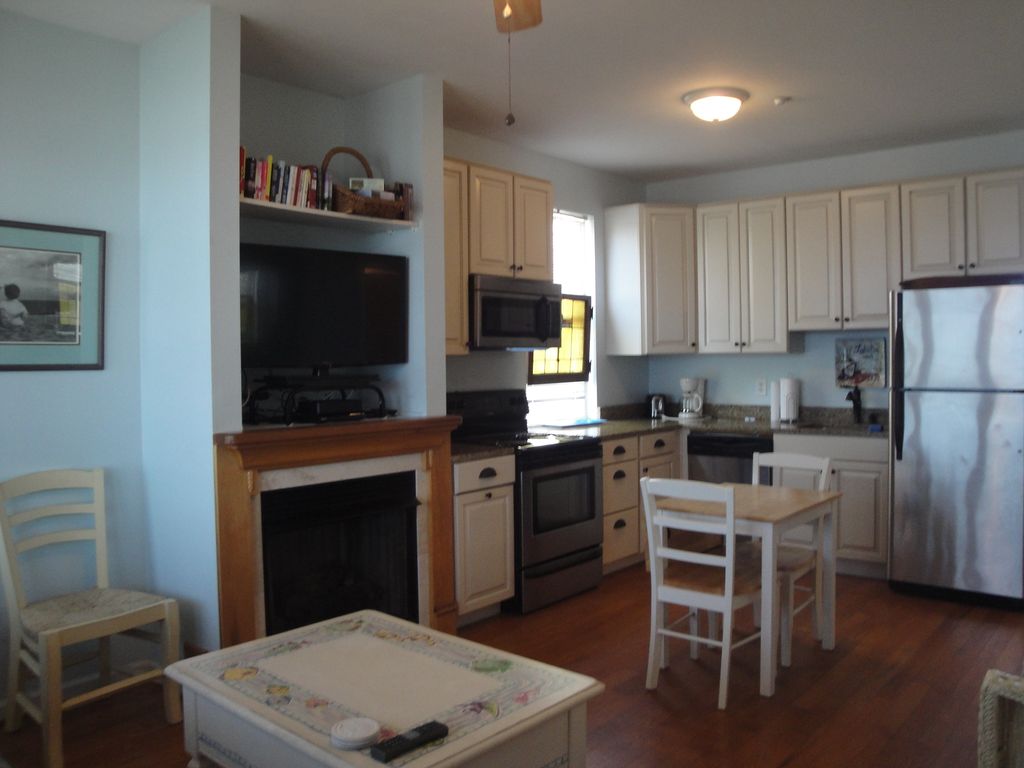 Sunday Aug 27th - Sept 1st is available for one last beach trip for the summer! Kids are back in school so should be nice and not too busy on the beach during the week.*** This oceanfront 1 bedroom 1 bath condo is both charming and cozy. It features hardwood floors, a gas log fireplace, new kitchen cabinets, granite counters, stainless appliances travertine counter in the bath with a vessel sink and new furniture. This condo is an end unit located on the third (top) floor of the building which gives you more privacy and a wonderful ocean breeze for those warm summer nights. You can enjoy both beautiful sunrises and sunsets from the covered porch as you watch the dolphins play.