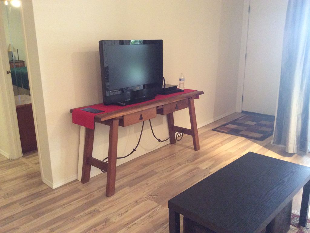 This is a first floor unit, (Ground level ) there are no stairs to worry about. Covered free parking just steps away. The condo, apartment has a 43 TV with standard cable package, a USB port for your Amazon / netflix membership, and has a very good WIFI, also a DVD WIFI player with apps. You will find foot rests under the TV / couch table. There is a remote for the bedroom fan / light on the left side of the bedroom door. We have 10 DVD movies for your use. There is a lot of storage space. Full closet in the bedroom. We have added a small TV that plays only DVDsin the bedrooms, with no cable in the bedrooms.