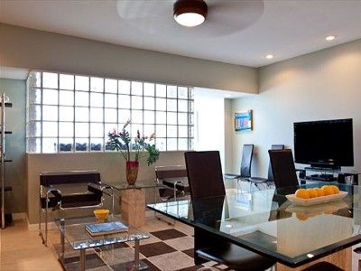 The PS Downtown Condo is the perfect cosmopolitan get-away for a couple or single person. A mid-century modern in downtown Palm Springs. This condominium features a beautifully landscaped courtyard pool and spa area amidst breathtaking mountain views, surrounded by the unique architecture of this magnificent gem built in the 1960s. Legend has it that Frank Sinatra and members of the Kennedy clan have vacationed at this hip and swanky Palm Springs address, with The Movie Colony nearby. It is fully furnished with designer black leather and chrome, mid-century/modern furniture. The elegant dining area can easily accommodate six or up to eight diners, with a large bar/serving area alongside. The television is a 42” Plasma HDTV with a home theater that includes an internet-connected Blu-ray player. The bedroom features a queen-size bed, and the full-size convertible futon sofa is in the living room. Guests with laptop computers will enjoy free high-speed wireless internet access and printer. The immense pool and 12-person spa are surrounded by an expansive deck, with chaises lounges, tables and chairs. The relatively few number of guests poolside at any given time make for quiet, tranquil basking in the sun and cooling off in the water. Adjacent to the pool area are a built-in gas grilling area, laundry room, workout room with cardio-equipment and weights, and men and women’s saunas. Please enjoy smoking outside only. Leave your car in your reserved, secure subterranean parking space, and take the elevator directly to your unit. A block away, you’ll find first class shopping boutiques and fine dining along dynamic Palm Canyon Drive. Stroll two blocks South and you’re at the front door of the new Palm Springs Spa Casino.
