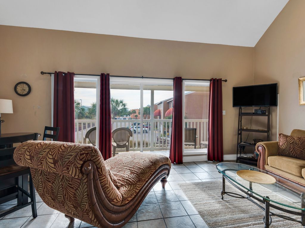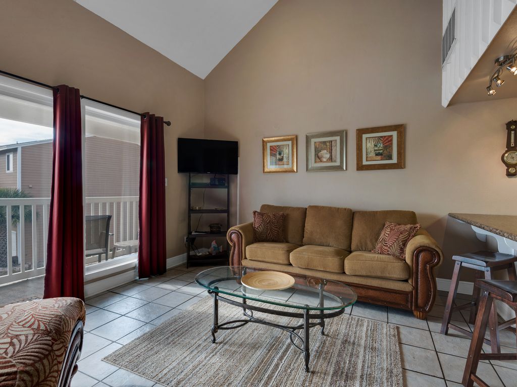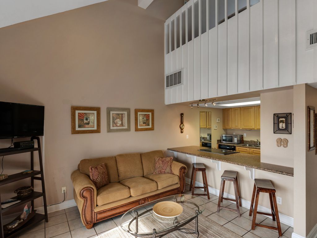 1 bedroom/1.5 bath condo located on Little Sabine Bay. King size bed and sofa sleeper located in the upstairs loft. Full bathroom located upstairs with the loft. Sofa sleeper located in the living room. TV and Blu-Ray in living room . TV/DVD/XBOX in bedroom. Washer/dryer in balcony closet.