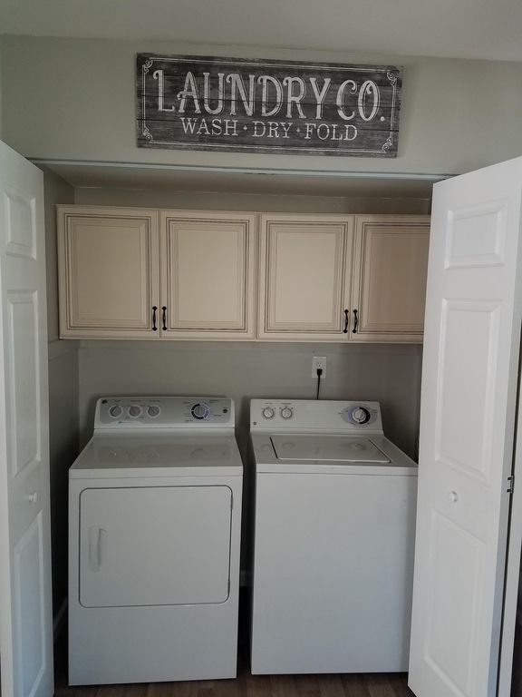 The brand new kitchen is equipped with refrigerator / ice maker, gas range, dishwasher, blender, mixer, coffee pot, place settings for 10, pots, pans and slow cooker.