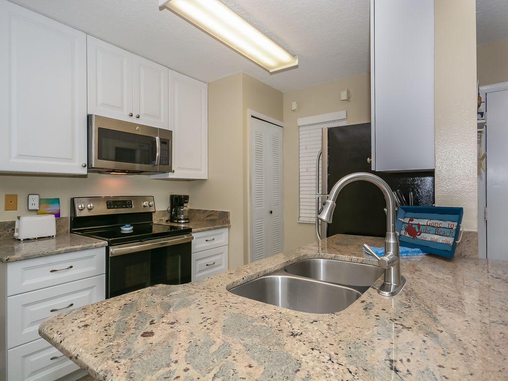 The cozy master bedroom features a queen size bed, flat screen TV, DVD and private bath with walk-in shower. The 2nd bedroom features 2 twins. The 2nd bath features a tub/shower. This condo features a washer/dryer. This unit does not have WiFi, there is WiFi at the pool.