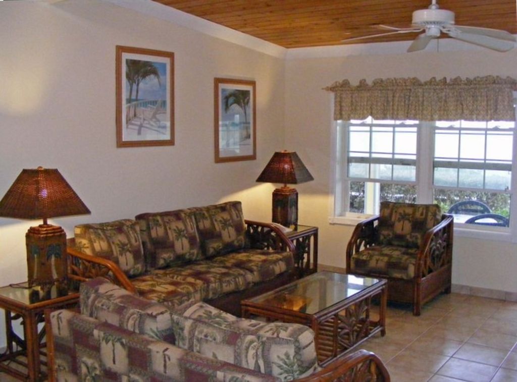 The villa is fully furnished in a tropical decor, with a full service kitchen, an eating area, living room, 1 large bedroom, and 2 full baths. There is also a table and chairs on the covered front porch, which is perfect for any outdoor meal (pick up some take-out from Splash if you don’t feel like cooking!). Several restaurants, including the local fish fry (a great place to try authentic conch salad!), are in walking distance.