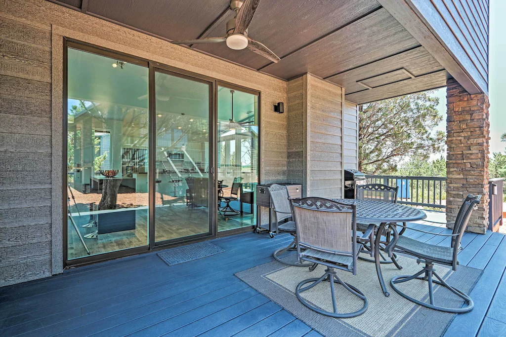 OUTDOOR LIVING: Wraparound deck, cooler, gas grill, dining table