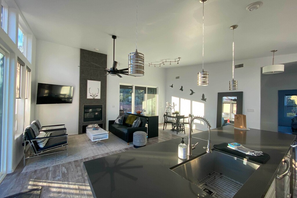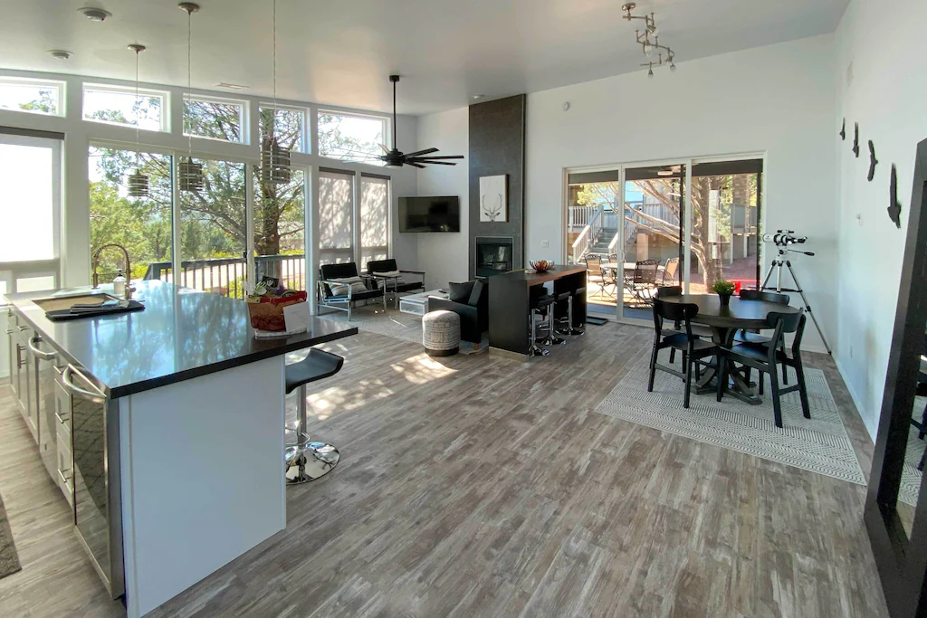 INDOOR LIVING: Open floor plan, gas fireplace, flat-screen TV, telescope