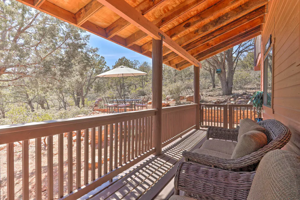 Take a deep breath and soak in the immense Arizona rim country from the balcony of this Pine cabin. Situated on 2.5 secluded mountain acres, this vacation rental has its own on-site trails through the rugged desert and the local bars and museums of downtown offer mountain-town hospitality, all less than 2 miles away! Return to this 2-bedroom, 1-bath cabin in the evening to enjoy the mild climate with your loved ones while roasting marshmallows around the fire pit as the stars come out overhead!