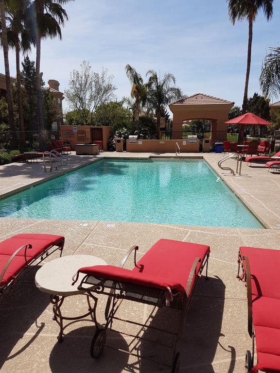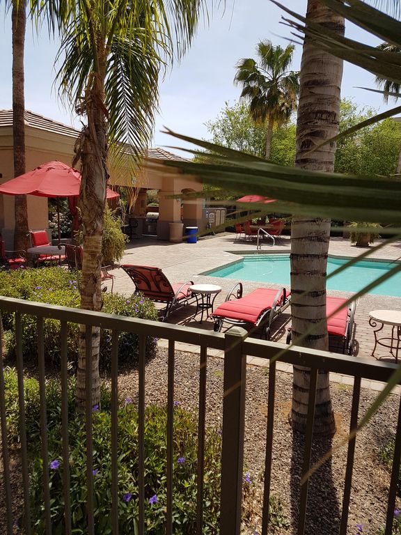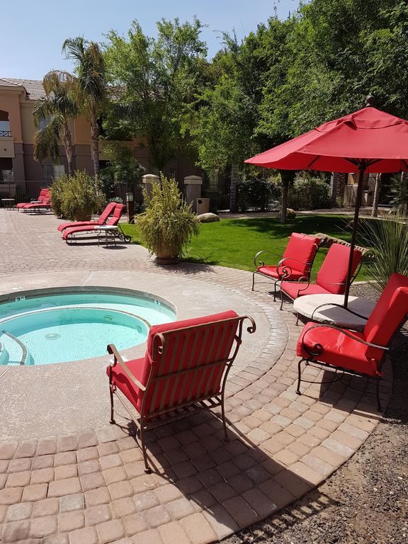 SUNNY HOLIDAY in the desirable SOLANA condo complex in beautiful Arizona. Situated on the boarder of Mesa and Gilbert, Just outside of Phoenix. Relax and enjoy this spacious GROUND LEVEL unit which features 2 master bedrooms each with its own private ensuite. Affords plenty of privacy for two couples or a family.
